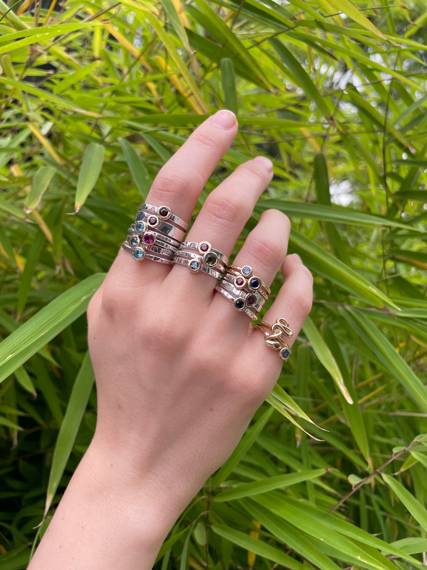 These stunning stacking rings are perfect on their own or paired together. Choose from a variety of gemstones with silver or gold.