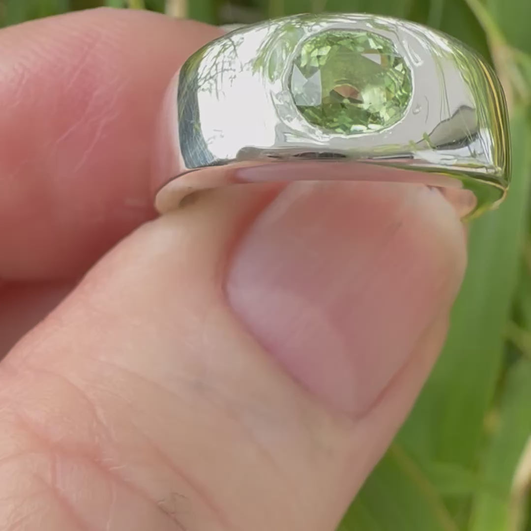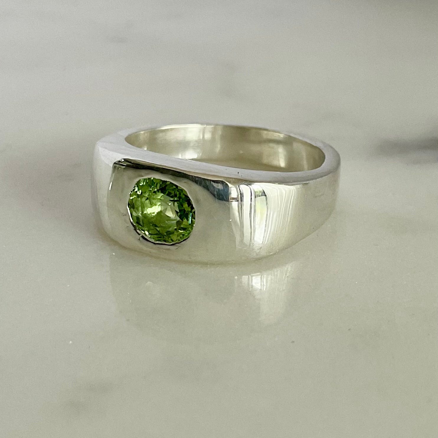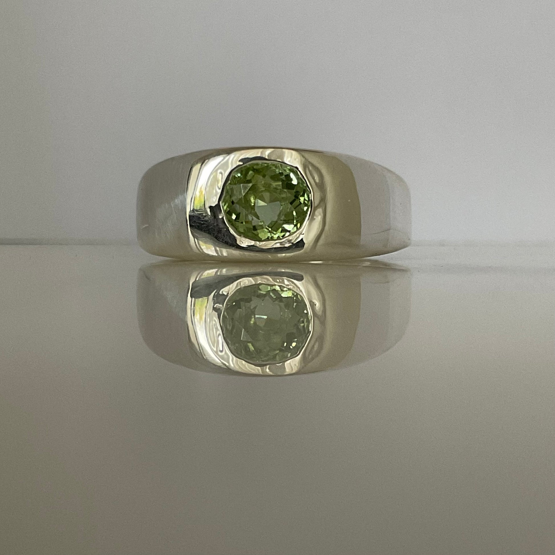 This stunning green tourmaline oval gemstone is set in a sterling silver chunky ring band . The centre stone is an oval (6x5mm) green tourmaline which is flush set and suitable for everyday wear.