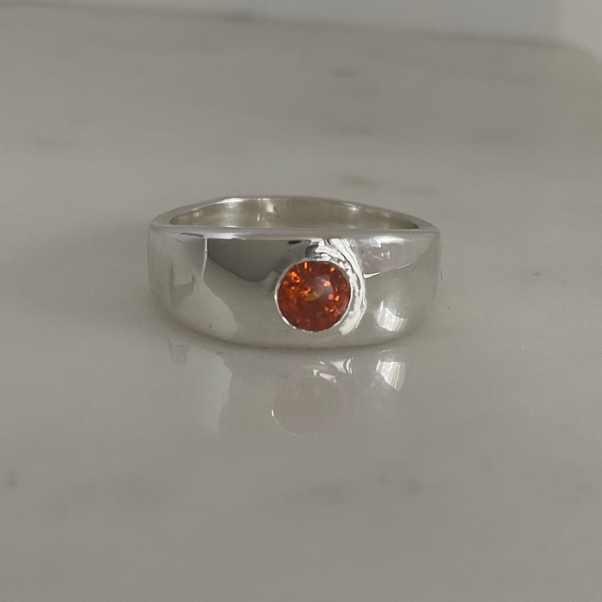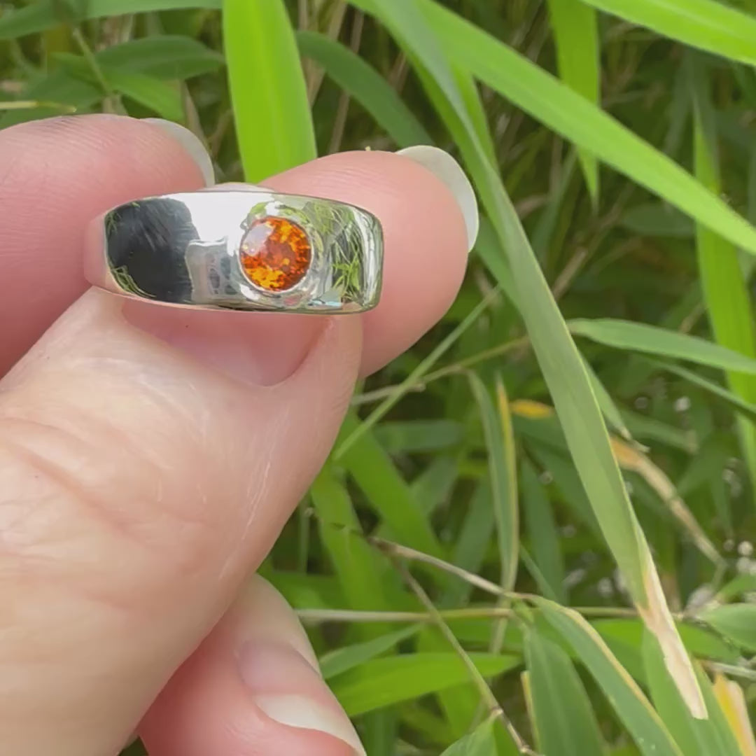 This stunning orange spessartine garnet is set in a sterling silver chunky ring band . The round centre stone (4.6mm) is flush set and suitable for everyday wear including as a pinky ring.