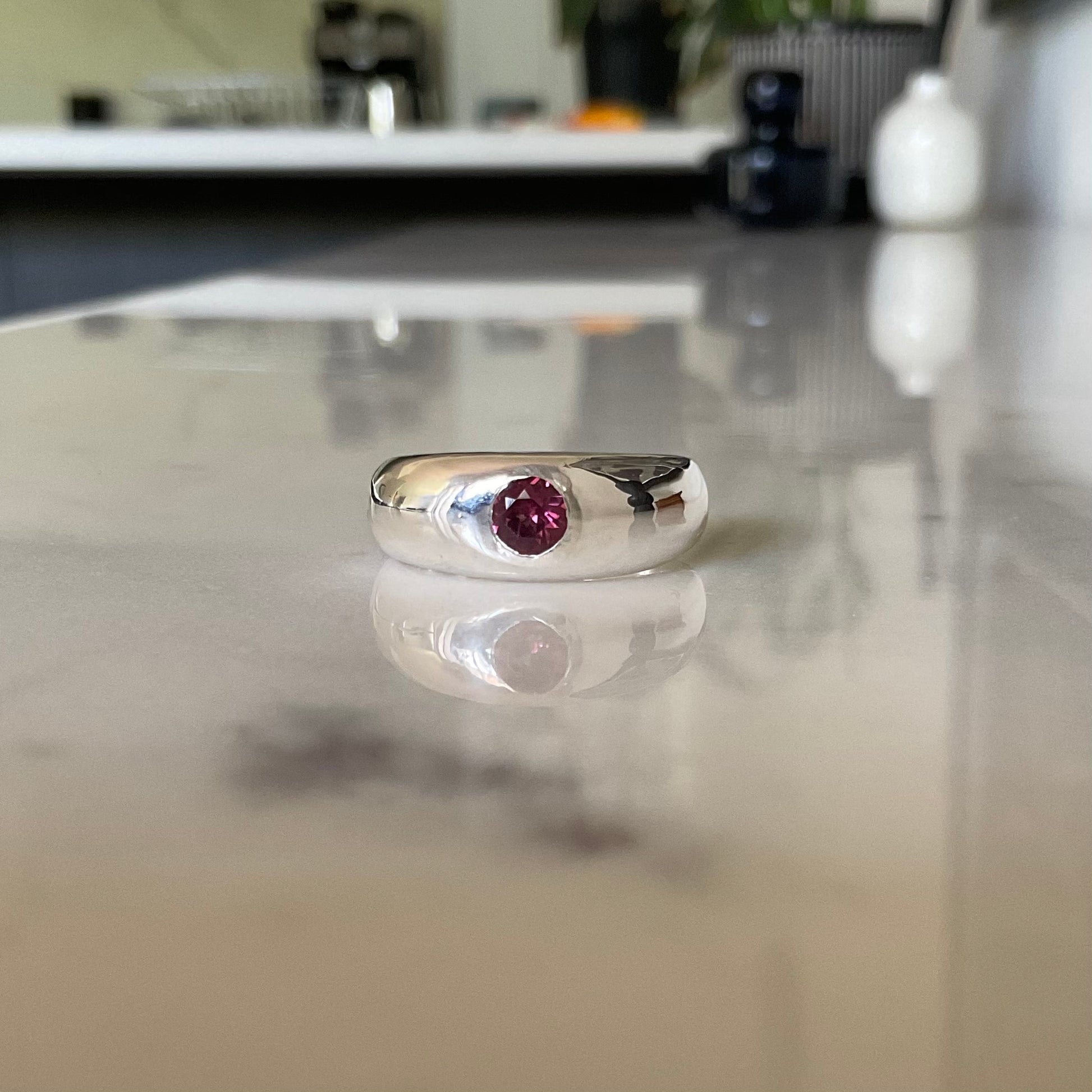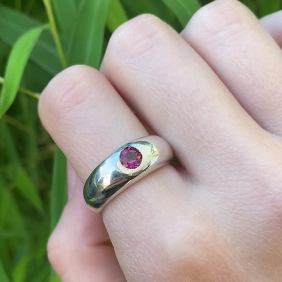 This stunning pink rhodolite garnet is set in a sterling silver rounded chunky ring band . The round centre stone (5mm) is flush set and suitable for everyday wear. The ring band is 8mm wide tapering to 4.5mm at the back to ensure a comfortable fit.